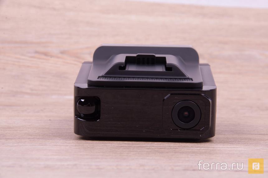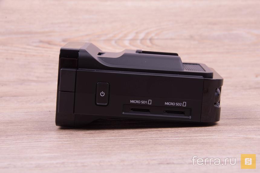 На противоположной от экрана стороне у регистратора находится камера и приёмник радар-детектора. На левом боку —нестандартный порт для питания от бортовой сети автомобиля, утопленная в корпус кнопка сброса и микрофон.